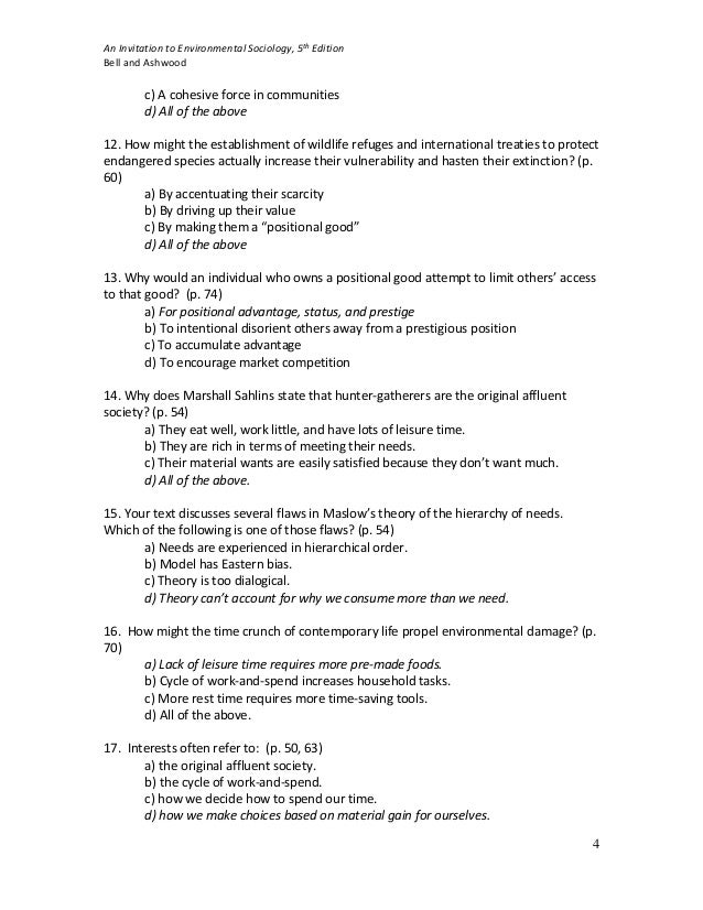 A test bank will include the following questions: True/False. The Second Edition of An Invitation to Environmental Sociology. The highly praised Fourth Edition of An Invitation to Environmental Sociology brings out the sociology of environmental possibility, inviting students to delve into this rapidly changing field.