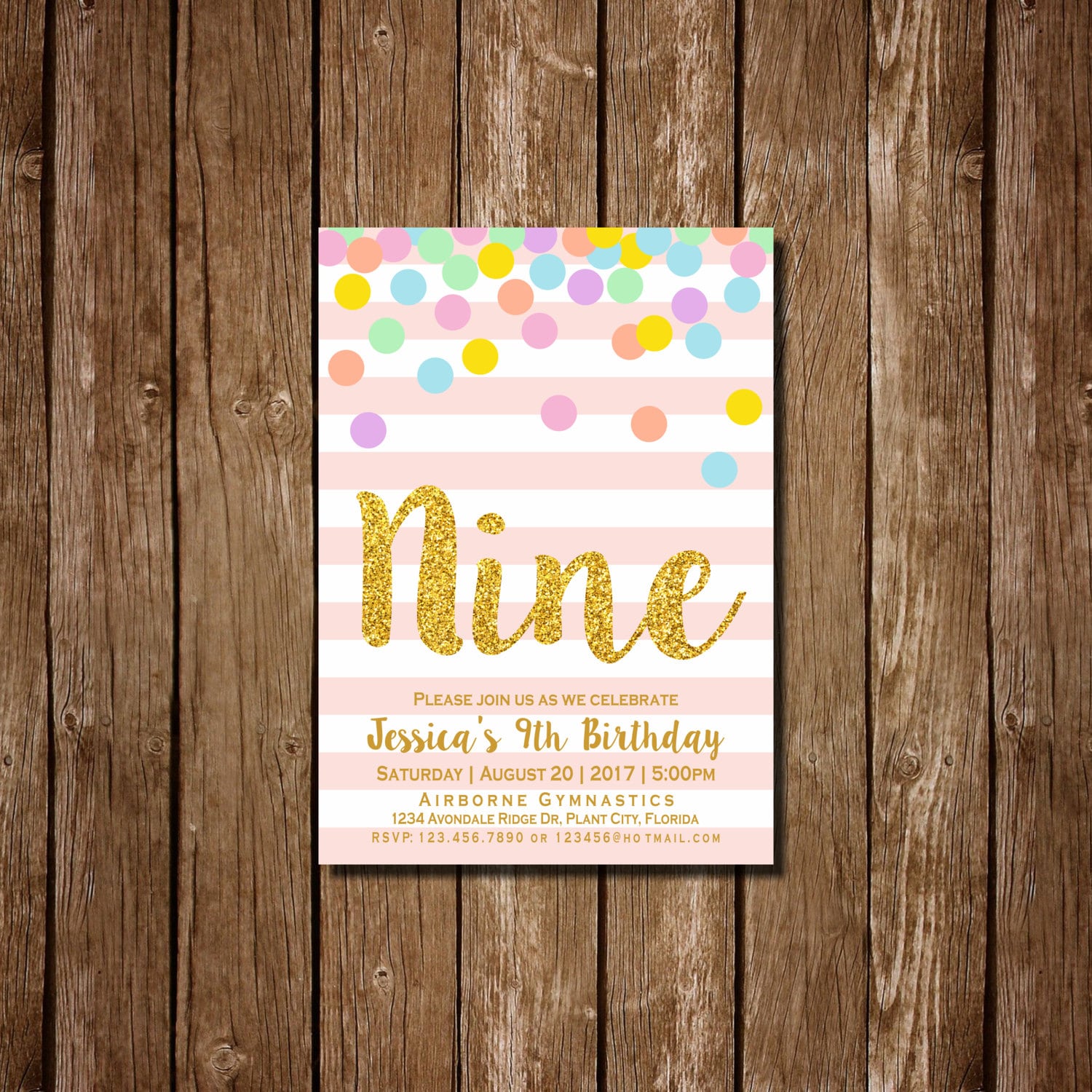 Girl 9th Birthday Invitation Pink and Gold Ninth Birthday ...